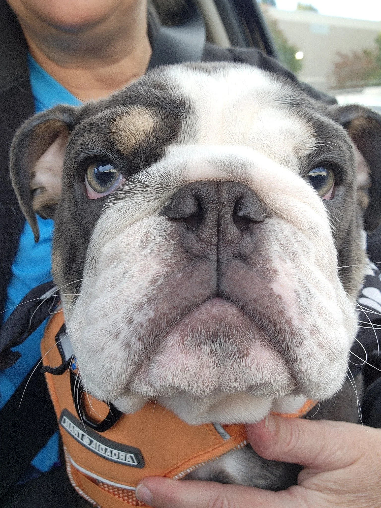 Twix is an English Bulldog who is definitely a Daddypads’s girl and never leaves his side. Her favorite game is chasing the Batman laser light. All she cares about is when Daddy is coming home if hes gone. She spends her day right at his side. Literally. Once in awhile she will play with the boys. And stare at lights on the ceiling. Shes obsessed with moving lights and shadows. She only cares about me at bedtime when she may snuggle for a minute. But then it's back to Dad.